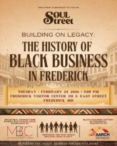 Hosted by SOUL Street, is an evening rooted in connection, history, and forward movement. We’ll start with a Networking Power Hour sponsored by the Maryland Black Chamber of Commerce creating space for real conversations, meaningful introductions, and shared vision. The night continues with an impactful presentation by the AARCH Society, uncovering the powerful stories of Black-owned businesses that helped shape Frederick’s cultural and economic foundation. This is about honoring what came before us while strengthening what comes next. 5 pm at Frederick Visitor Center. Free. Register at Building on Legacy: The History of Black Business in Frederick